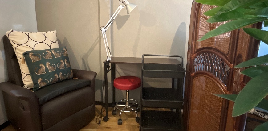 ・テーブル1、テーブルライト、リクライニングチェア1(リクライニング140度、フルフラットにはなりません)、施術者用椅子1、荷物置き1、フットバス1、ワゴン1、ハンガーラック、電源、音源(基本選べません)、WiFi、お客様用スリッパ1、トイレ、エアコン使用可